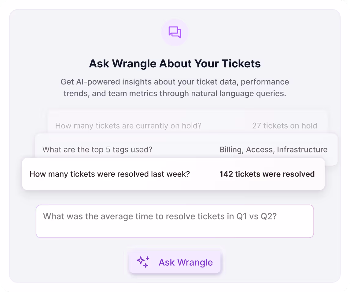 Wrangle AI deflects 75% of common tickets by leveraging your knowledgebase to instantly respond and answer user questions directly in Slack.