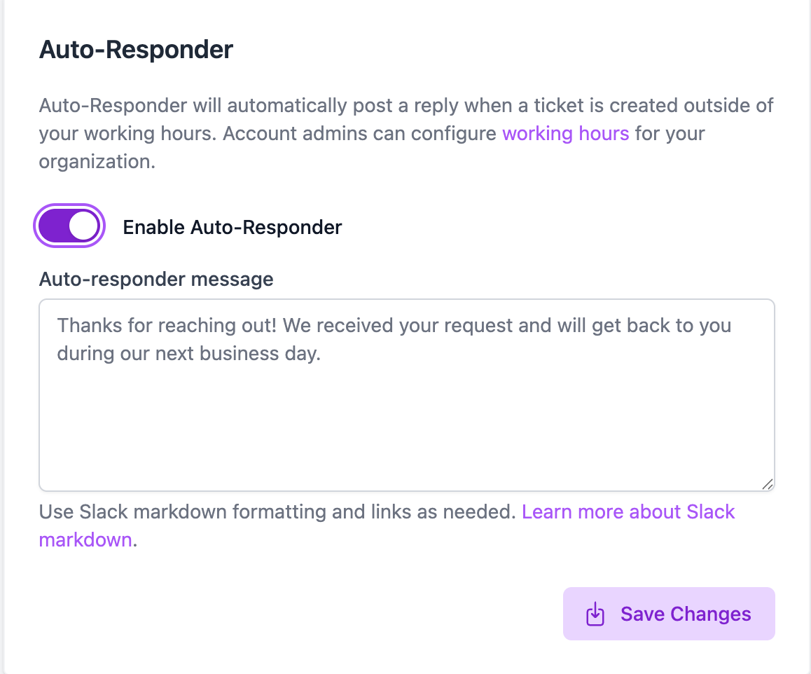 Wrangle can now auto-respond to tickets created after hours. Customize messages based on your availability so requesters know exactly when to expect a reply. Set up auto-responders