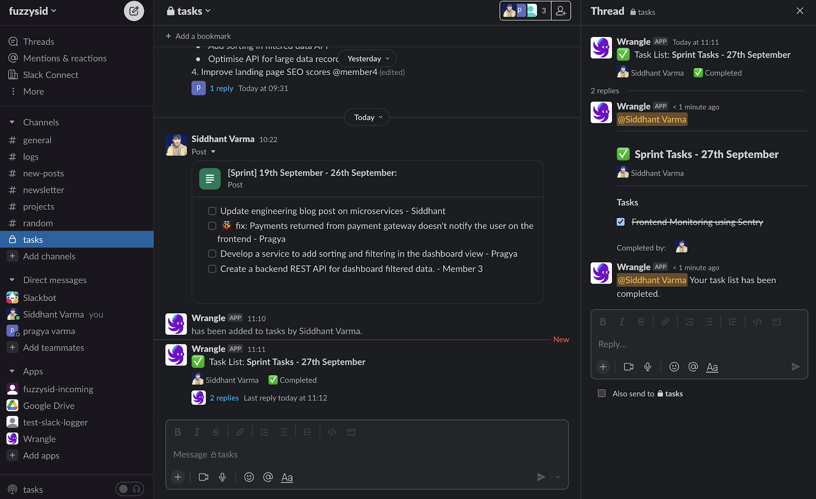 Wrangle will send the assignee a notification, and you can see it’s automatically posted in the 'tasks' channel: