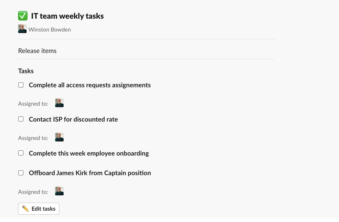 Any member can now open this Slack post and mark a checklist item as done when they're finished.