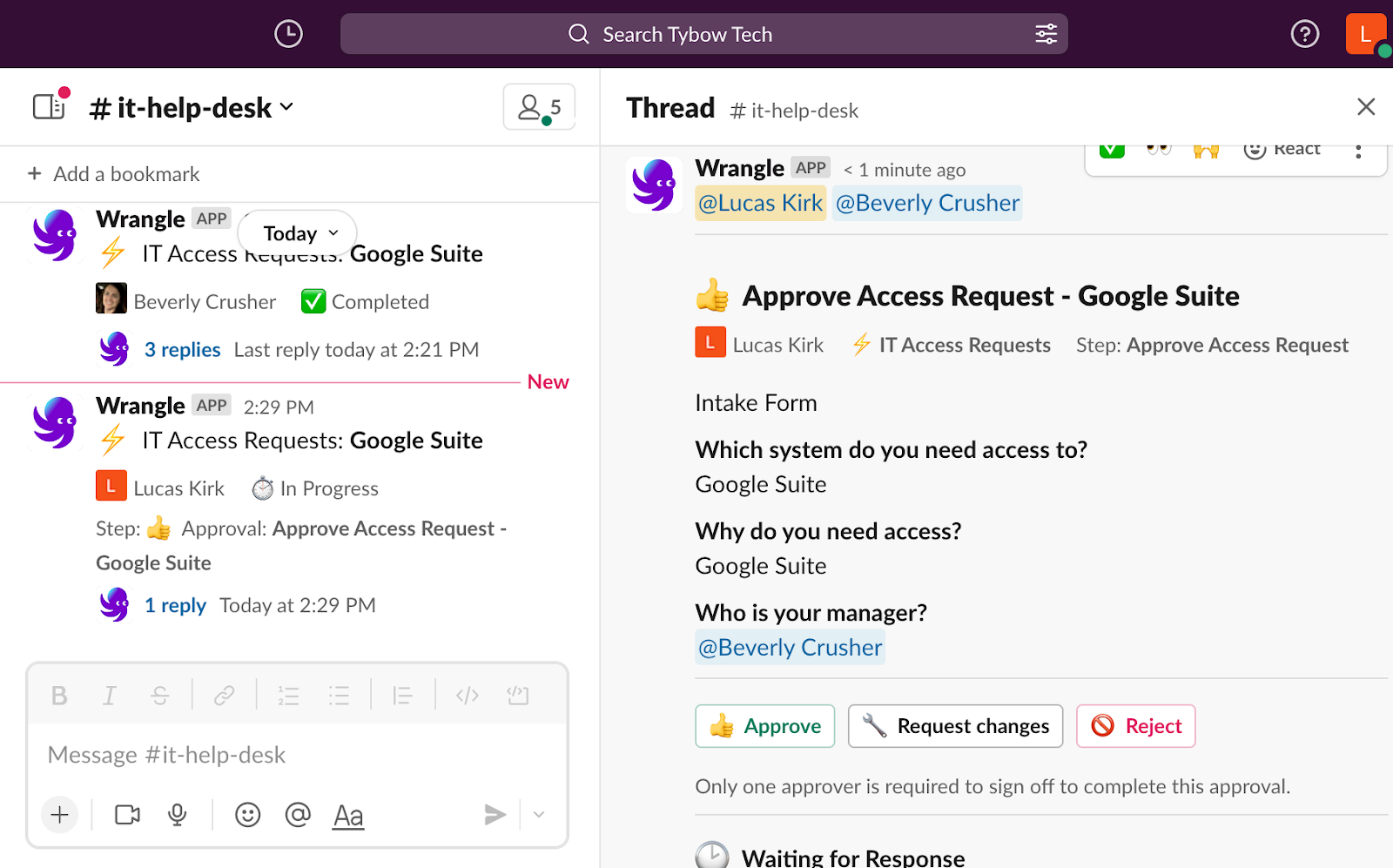 Once Lucas submits his request, the workflow will ping his manager Beverly for approval. If Beverly is unavailable to approve access, she can re-assign this request to another team member. She could also send the request back to Lucas for more information. Wrangle will post an alert in the Slack channel so other members can see the request, helping maintain a transparent work environment.